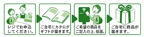 セイムスカードをご提示のうえ、ギフトカタログお申し込み希望と店舗スタッフにお申し付けくださいませ。