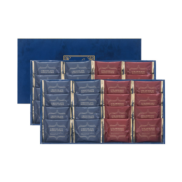 バスケットに詰められたワッフルとクッキーのセットです。見た目も可愛らしく、贈り物としてもぴったりです。