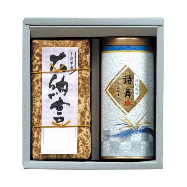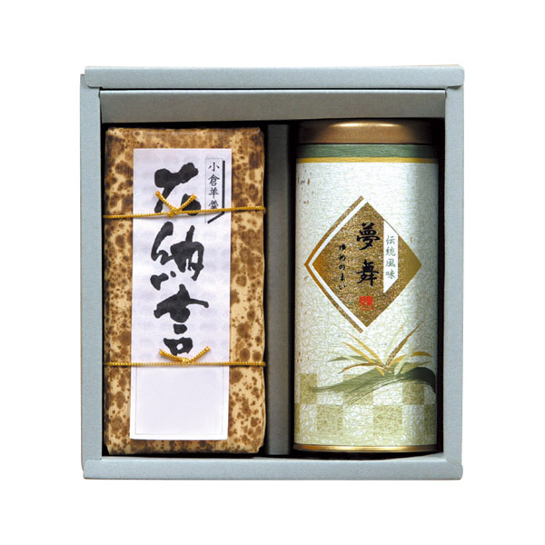 大納言羊羹と高級銘茶がセットになった一品です。日本の伝統的な甘さとお茶の風味を楽しめます。