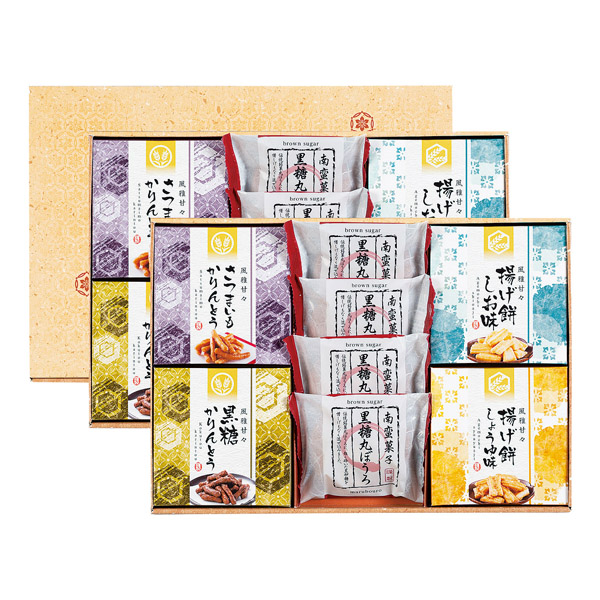 粗く砕いた黒糖を練り込んだ黒糖丸ぼうろと国産玄米から作られた米油100%で揚げたさつまいもかりんとう、黒糖かりんとう、国産のもち米を使用し、米油とごま油をブレンドした油で揚げた揚げ餅(醤油)、揚げ餅(塩)の詰合せです。