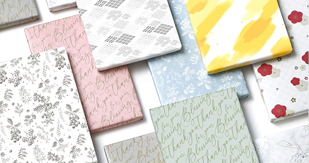 ご希望の用途に応じたのし・包装紙・定型挨拶状をお選びいただけます。