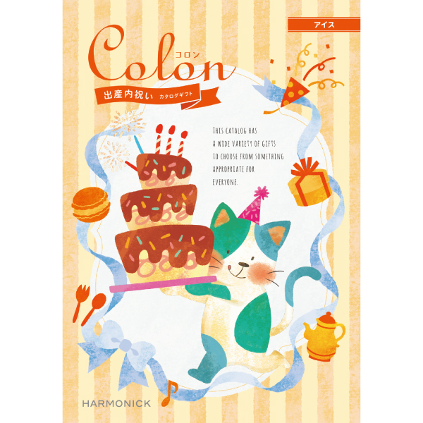 「コロン アイス」は、出産祝いへのお返しとして人気が高いカタログです。柔らかな色使いとイラストが印象的な表紙で、ベビーグッズやファミリー向けの体験商品、育児を助ける日用品などが豊富に掲載されています。