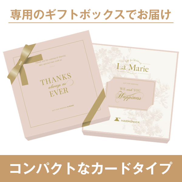 「ラ・マリエ e-book」は、結婚関連の贈り物として人気の「ラ・マリエ」シリーズのカードタイプです。手のひらサイズのカードでかさばらず、持ち運びやすいため、二次会などでもゲストの負担になりにくく、引き出物としても重宝されています。カードとボックスには「ありがとう」の言葉がさりげなくあしらわれており、気持ちをしっかりと伝えられる工夫がされています。