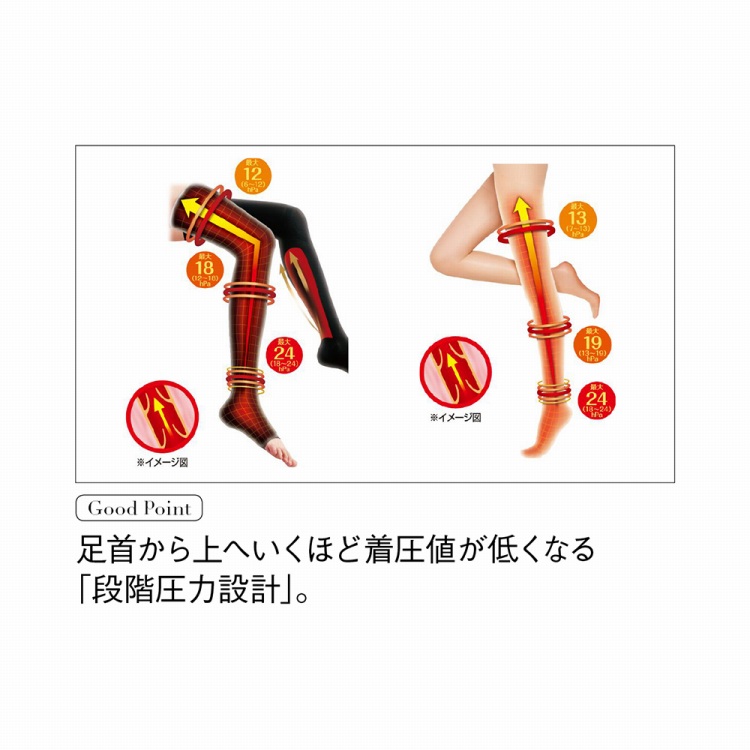 リンパの流れと血行を改善する高い着圧値とスリムウォークの「段階圧力設計」で、静脈の血行やリンパの流れを促進して脚のむくみを改善します。