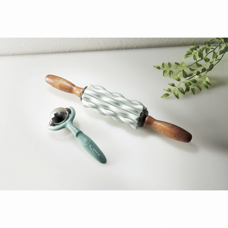 首や鎖骨まわりをコロコロするジェル内蔵ステンレス製ボールローラーと、もちもち素材&ウェーブ形状のローラーのセット。