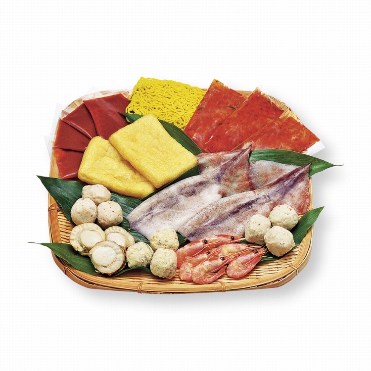 商品内容●セット内容:ボイル甘えび×6、ボイル帆立×3、ツボ抜するめいか・油揚げ各2、ラーメン80g×1、つみれ(かに入・えび入・とりごぼう各3)、白菜キムチ(韓国産)300g、たれ付