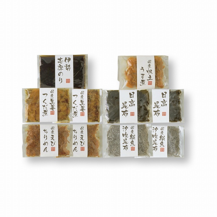 商品内容●セット内容:生姜つくだ煮50g・日高昆布50g・えびちりめん30g・絹糸汐吹昆布20g各2、伊勢志摩のり100g・帆立うま煮50g各1