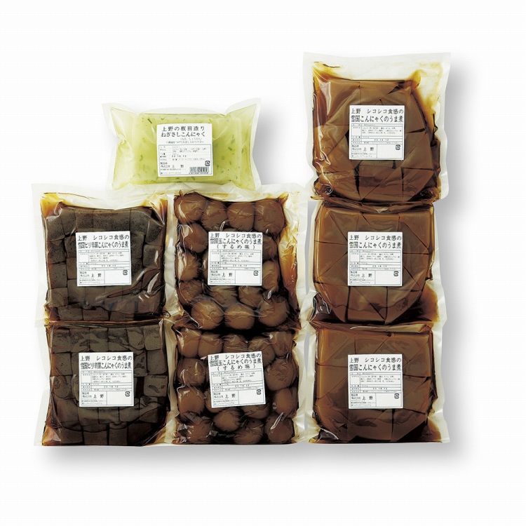商品内容●セット内容:こんにゃくのうま煮500g×3、ピリ辛黒こんにゃくのうま煮490g・玉こんにゃくのうま煮17個入各2、ねぎさしこんにゃくブロック280g×1