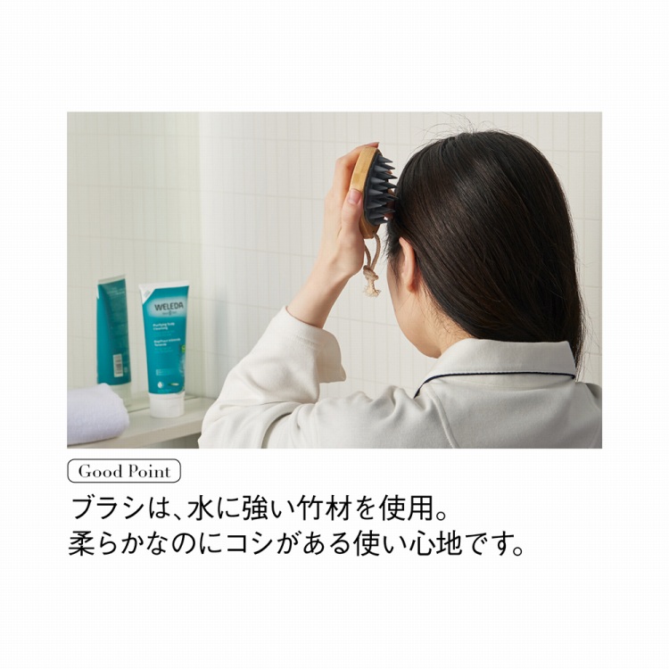 ヘッドブラシは、弾力のあるブラシヘッドが心地よい刺激で頭皮の血行を促し、爽快な洗い上がりに。