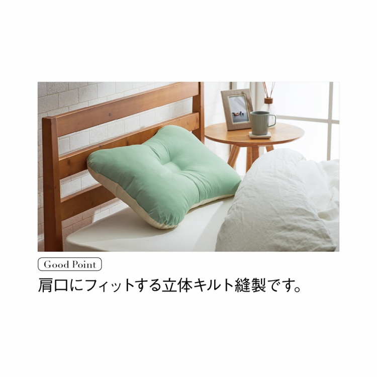 肩口にフィットする立体キルト縫製のまくらは、ご家庭で洗えるのでいつも清潔にご使用いただけます。
