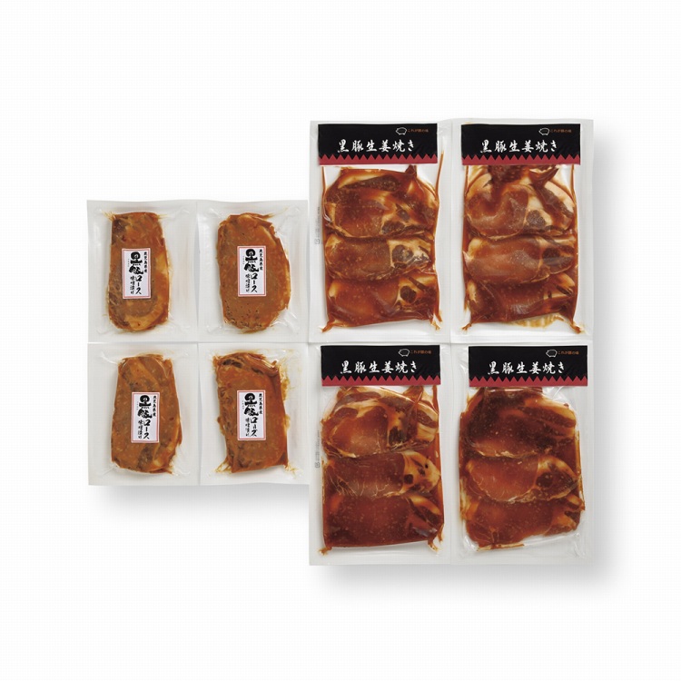 商品内容●セット内容:黒豚ロース生姜焼140g(合計3枚入)・黒豚ロース味噌漬100g(1枚入)各4