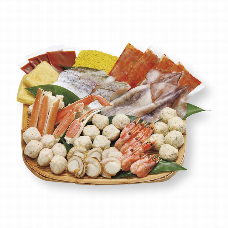 商品内容●セット内容:ボイルズワイガニカット200g×1、ボイル甘えび×12、つみれ(かに入・えび入・とりごぼう各6)、ボイル帆立×6、助宗鱈切身×3、ツボ抜するめいか・油揚げ各2、ラーメン80g×1、白菜キムチ(韓国産)400g、たれ付