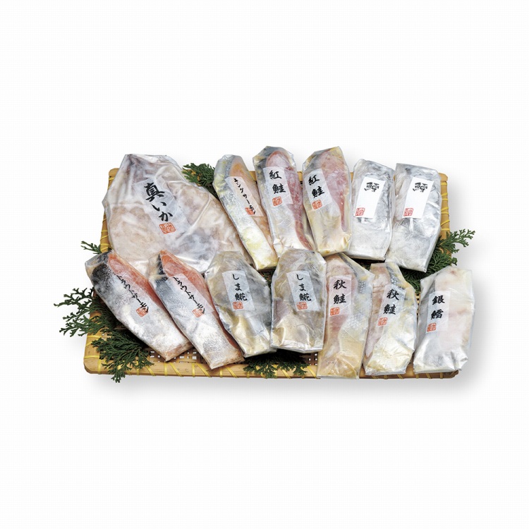 商品内容●セット内容:秋鮭甘味噌漬80g・しまほっけ甘味噌漬80g・真鱈粕漬80g・紅鮭西京漬80g・トラウトサーモン粕漬80g各2、銀鱈粕漬80g・キングサーモン西京漬80g・真いか粕漬150g各1