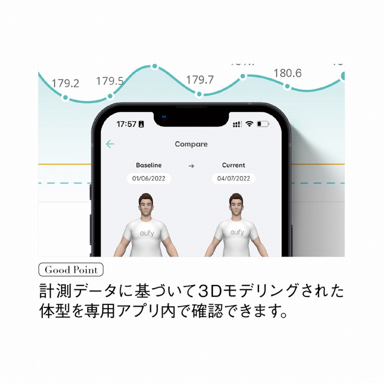 体重やBMI、体脂肪率などの基本情報のみではなく、心拍数、筋肉量、骨量、体年齢、皮下脂肪率などのカラダに関する16の項目を測定できます。