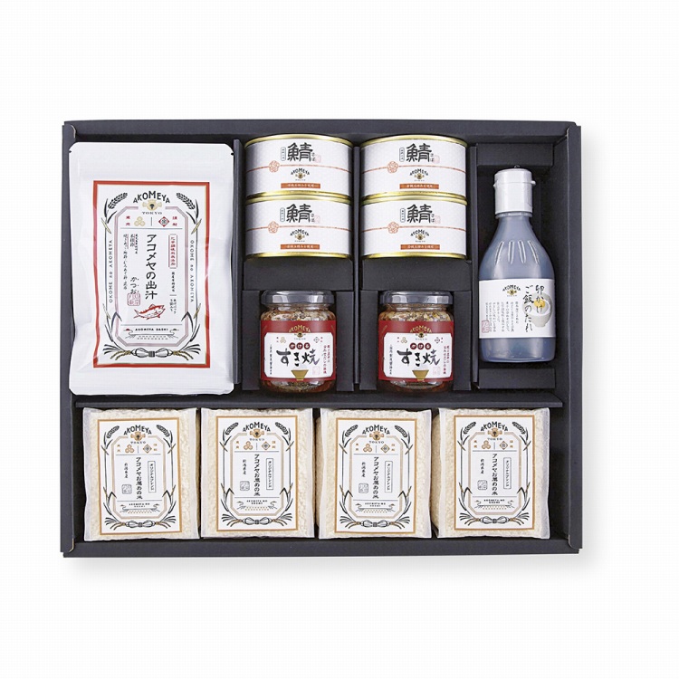 商品内容●セット内容:オリジナルブレンド米1.8kg(450g×4)、アコメヤの出汁かつお(10g×5)×5、鯖缶(五徳味噌味)180g×4、かけるすき焼130g×2、卵かけご飯のたれ200ml×1