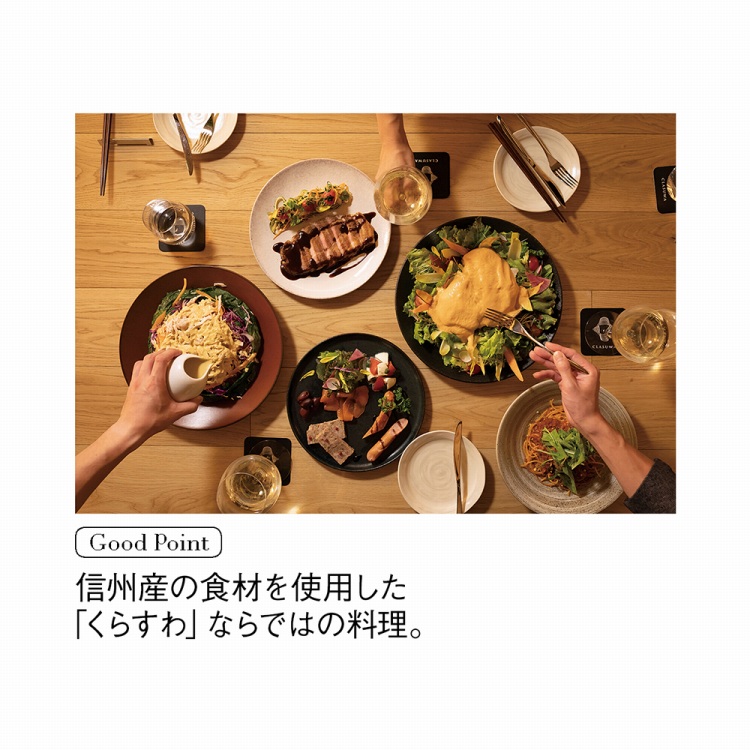 信州の自然に育まれた野菜や、「信州十四豚」などの素材を使用し、美味しさとすこやかさにこだわった「くらすわ」ならではの料理をご堪能ください。