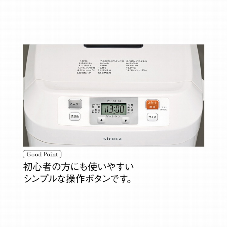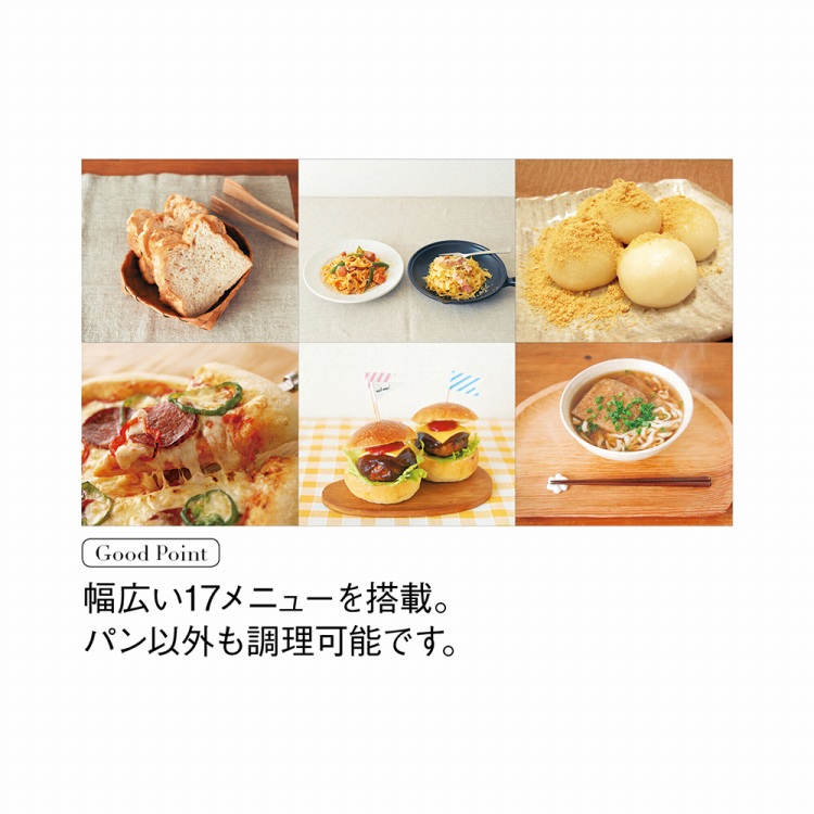 基本的なパンはもちろん、全粒粉パンやアレンジパン、さらにフレッシュバターやジャム、うどん・パスタ生地・お餅なども作ることができます。