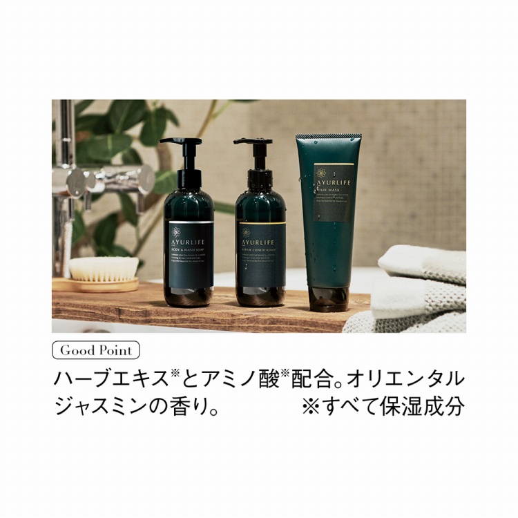 ハーブエキス※とアミノ酸※配合で優しく髪を洗い上げるシャンプー、コンディショナーとヘアマスク、ハーブエキス※と植物油※配合で、優しく肌を洗い上げるボディー&ハンドソープの4種セット。