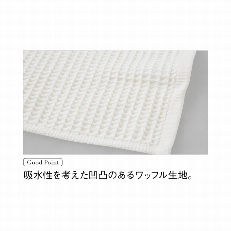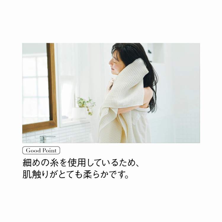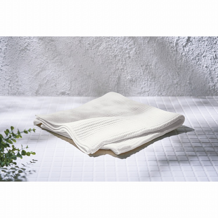 さらりと気持ちよいワッフル素材のバスタオルは、ヘム(タオルの裾部分)や耳(タオルの両サイド)がしっかりしており、型崩れが少ないことが特徴です。