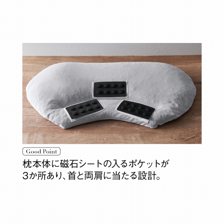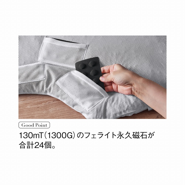 ●材質:枕/(側地)ポリエステル100%・(詰めもの)熱可塑性エラストマー、カバー/(表面)綿100%・(裏面)ポリエステル65%・綿35%、磁石/フェライト永久磁石130mT(1300G)×24個