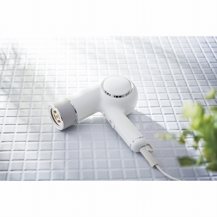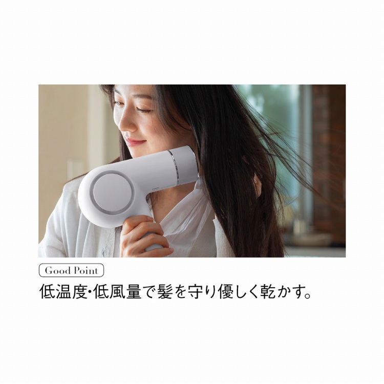 髪ダメージを軽減する「低温度」「低風量」にこだわりつつ、ノズルから出る均等なやさしい風と遠赤外線の力により、「髪を守る」と「速く乾かす」を両立。