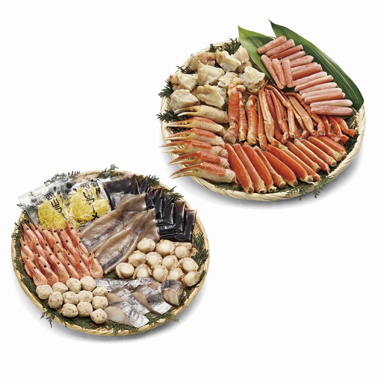 商品内容●セット内容:ボイルズワイガニカット400g×3、生ズワイガニ棒ポーション200g×1、ボイル甘えび×24、かに入つみれ・ボイル帆立各12、助宗鱈切身×6、ツボ抜するめいか・ラーメン80g各2、たれ付