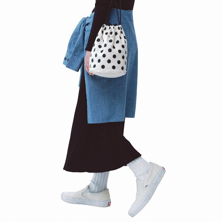巾着型の可愛らしいフォルムのハンドバッグは落ち着いたカラーリングのドット柄が特徴的。