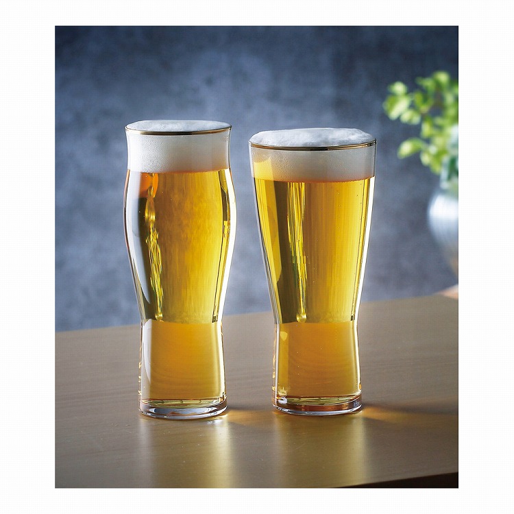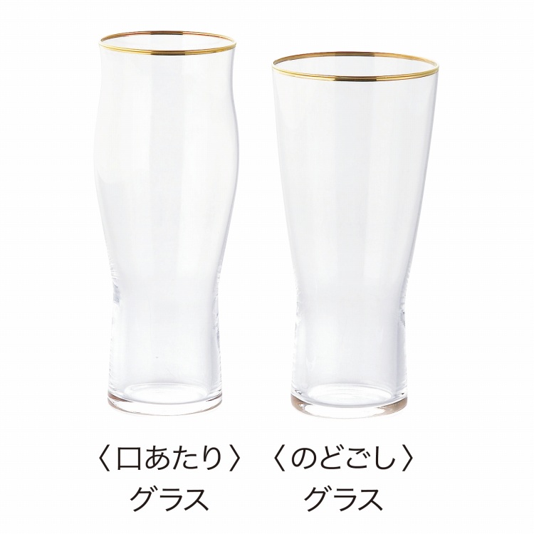 天開型の「のどごし形状」とウェーブ状で泡持ちの良い「口あたり形状」の2種類のグラスの口元には「縁金線」加工を施し、至福のひと時をより華やかに演出。