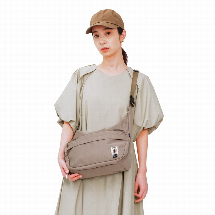 ポリエステル生地を使用したショルダーバッグは、三日月型で体に沿いやすいシルエットが特徴的。