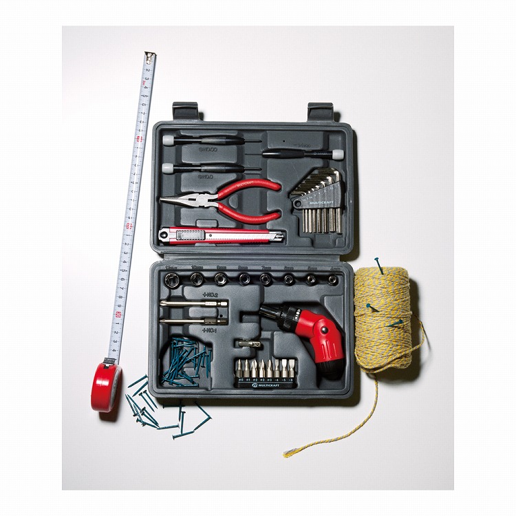 ●内容:六角棒レンチ・6.35mm角ソケット・ドライバービット各8・精密ドライバー×3・段付ビット×2・ラジオペンチ125mm・カッターS型・ラチェットドライバー(手動式)・6.35mm角ソケットアダプター・コンベックス2m各1