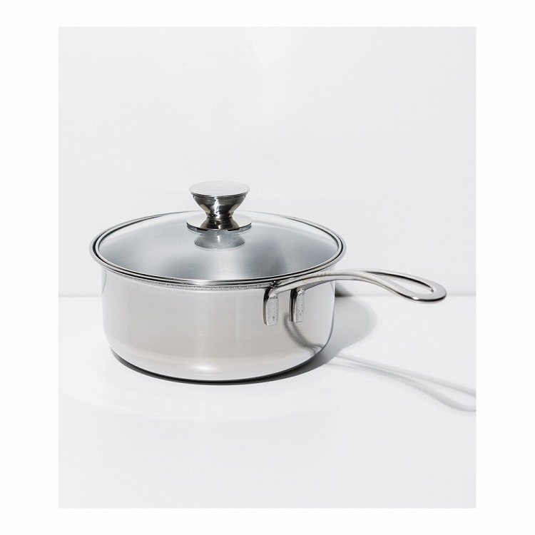 本体、ハンドル共に調和の取れたステンレス仕様の鍋は、直径約18cmとコンパクトなサイズで使いやすく、ガラス蓋で中身の確認もラクラク。