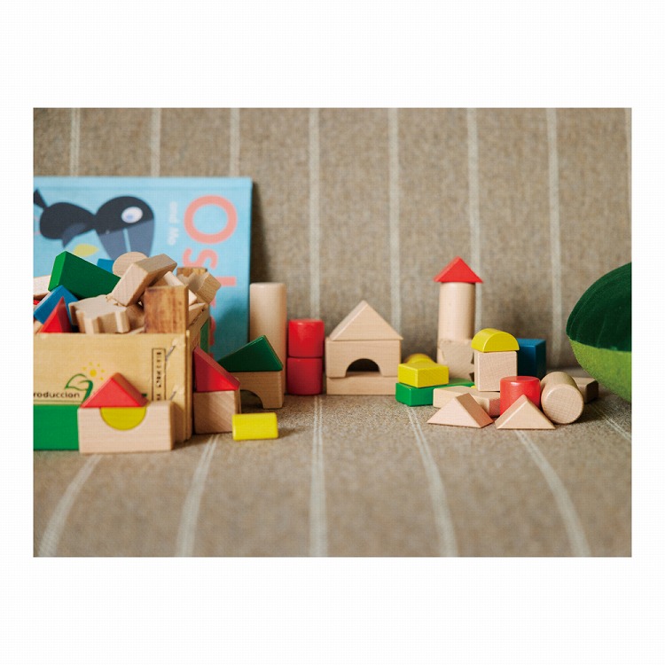 立方体、円柱、三角柱などの異なる形に、赤、青、黄色、緑などいろいろな色が入っていて箱を開けるたびにワクワクする木製つみき。