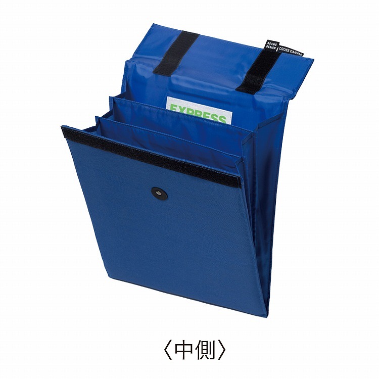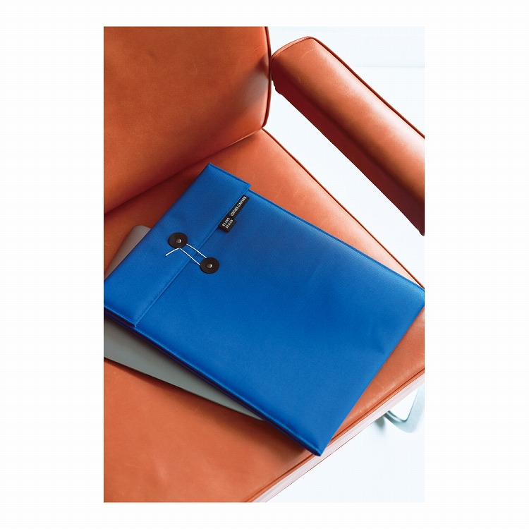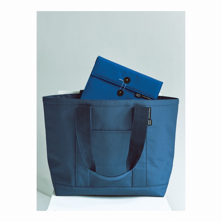 また、丈夫なポリエステル生地を使用した鮮やかなブルーのドキュメントケースは、開閉部が広がり3つの仕切りごとに書類やノートPCを収納できて、本体はトートバッグの内ポケットに納まるサイズ。