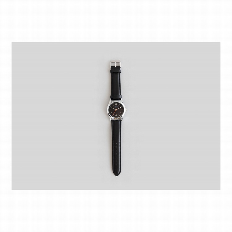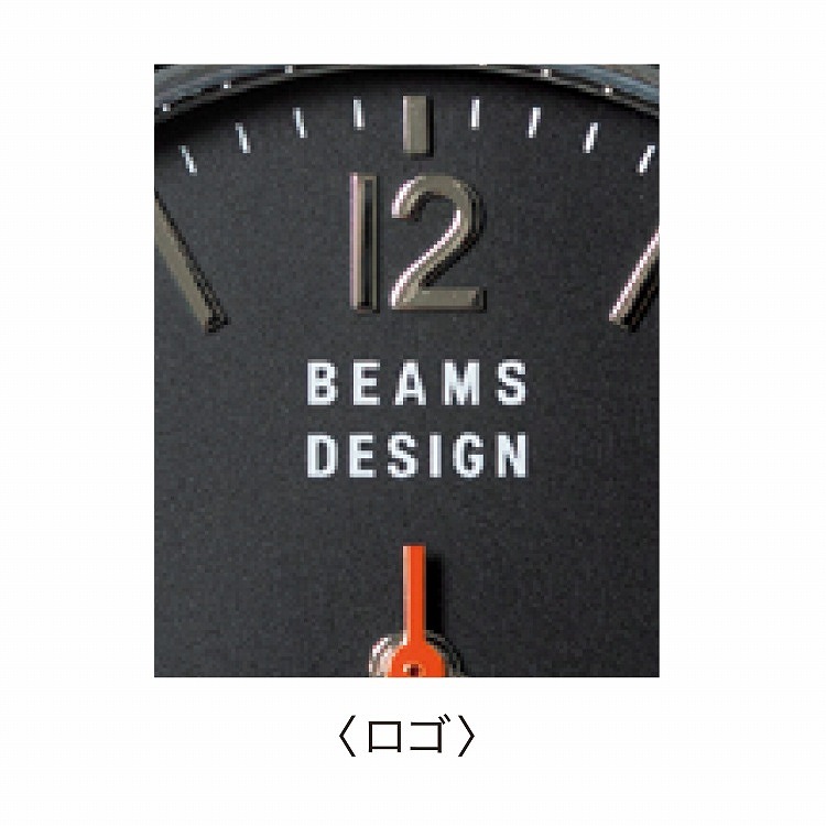 時針、分針、秒針という時計の基本構成要素を美しくエレガントに配置したシンプルなデザインの中に、12時と6時の位置に配されたアラビア数字と「BEAMS DESIGN」らしい視認性の高いオレンジ色の秒針がさりげないデザインのアクセントになっています。