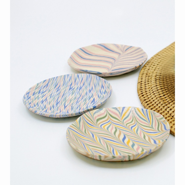 色の異なる粘土を練り合わせて模様を作る技法を用いた丸小皿揃です。