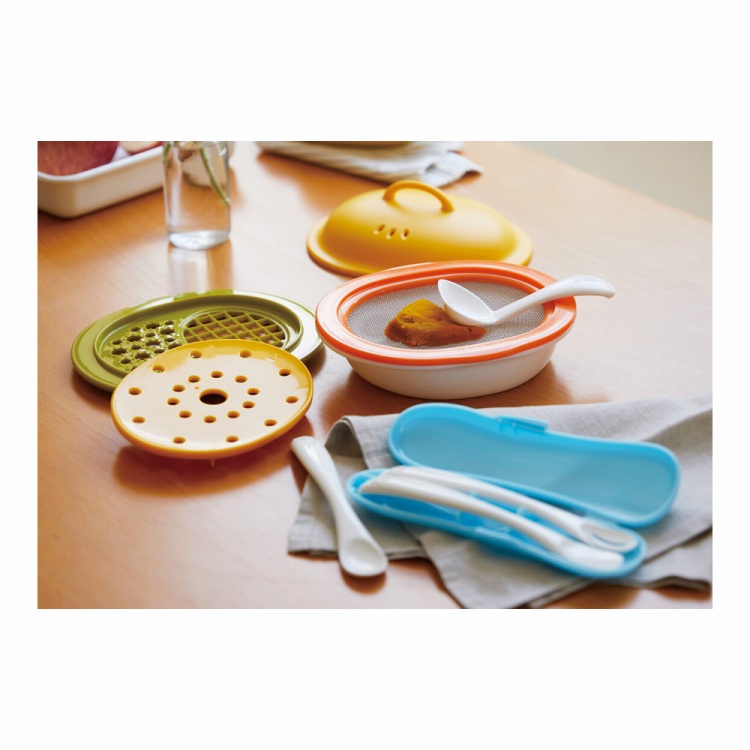 商品内容●商品:お食事ボウル(約13.5×17×高さ4cm・300ml)・蒸しプレート・カットおろしプレート・裏ごしプレート・フタ・調理用スプーン各1・離乳食スプーン×3