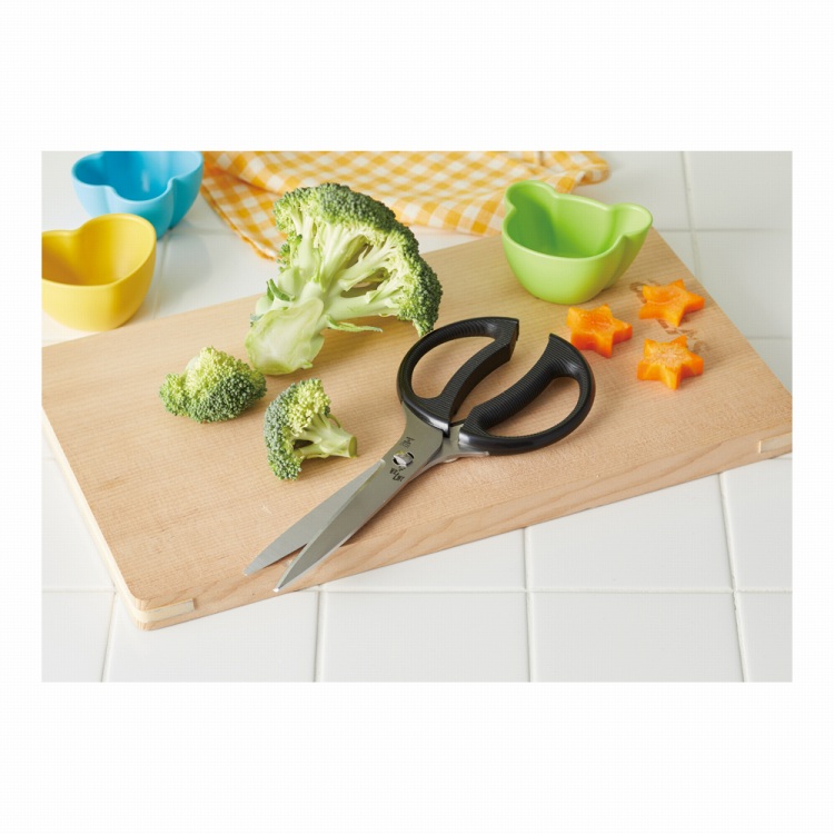 食材や牛乳・食品パックを一気に切りやすいロングタイプのキッチンばさみ。