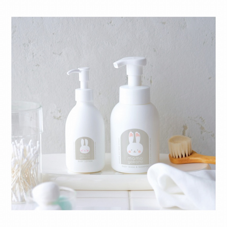 日本の米ぬかに着目して作られたさらっと伸びてみずみずしくうるおうベビーローションと、うるおいを守りながら、しっとり洗い上げる泡タイプの全身用シャンプー。