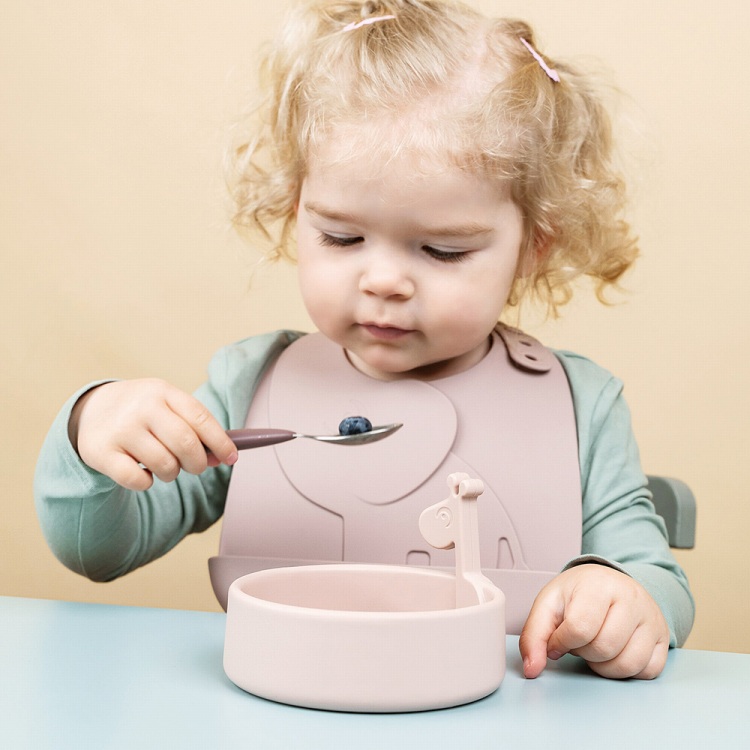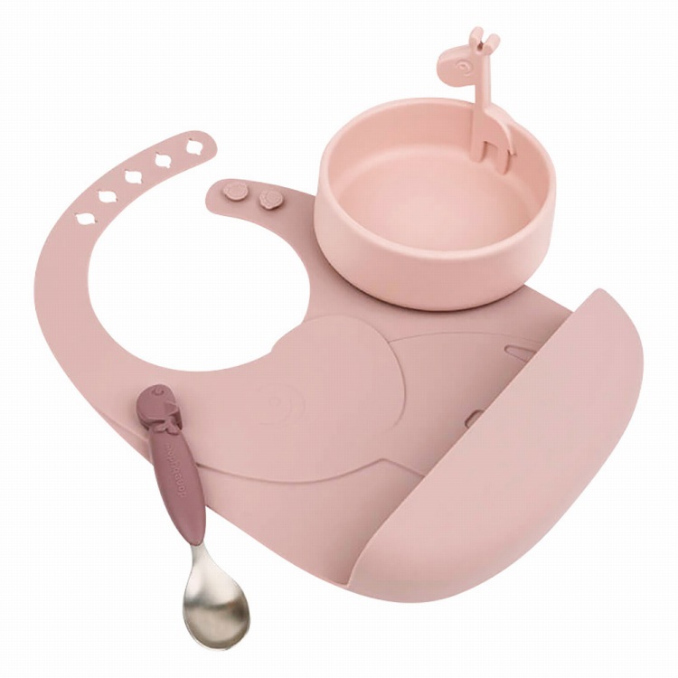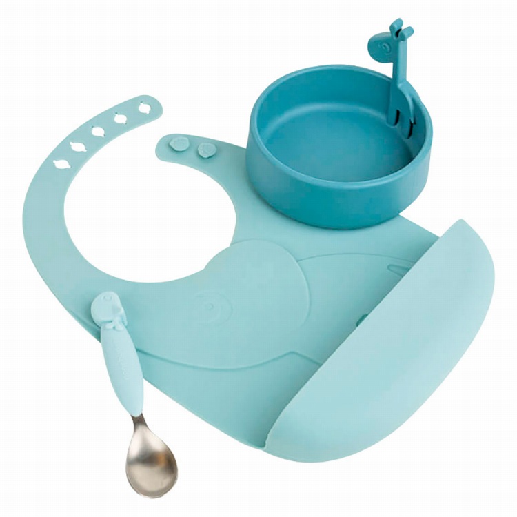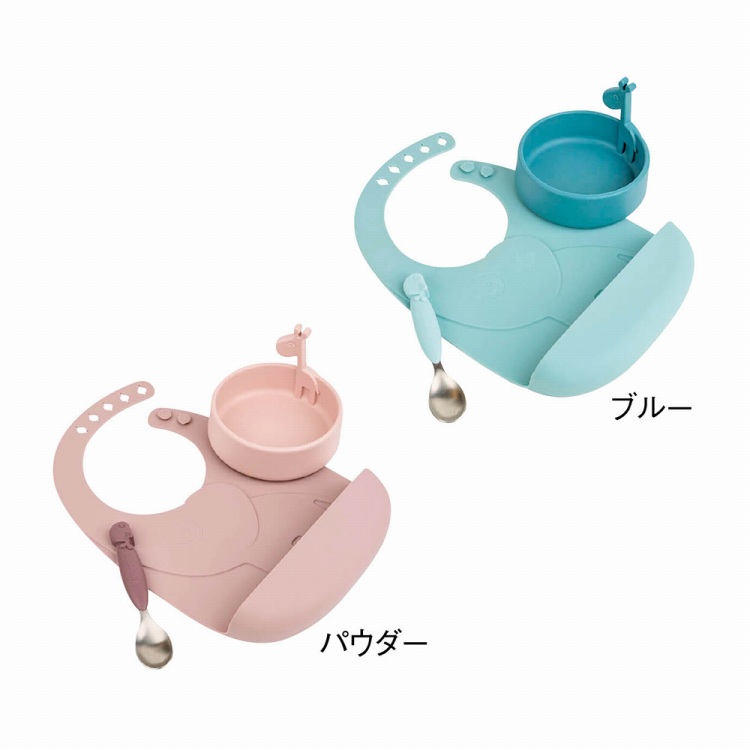 大きなポケットがついたビブ、キリンのボウル、握りやすいグリップのスプーンのシリコン食器セットです。