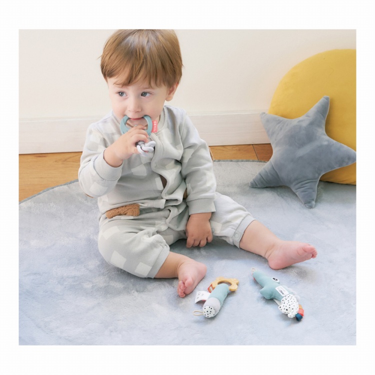 ベビーの発達段階に合わせ、2ヵ月頃からあそべる用途別の3種類のラトルをセットにしました。