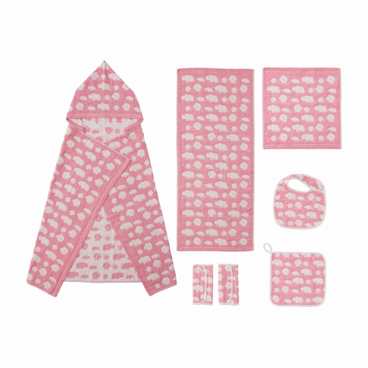 商品内容●商品:フェイスタオル(約34×80cm)・ウォッシュタオル(約34×35cm)・スタイ(約20×30cm・首まわり約30cm)・ループ付きハンカチ(約25×25cm)・フード付きバスタオル(約100×95cm)各1、ベルトカバー(約16×20cm)×2