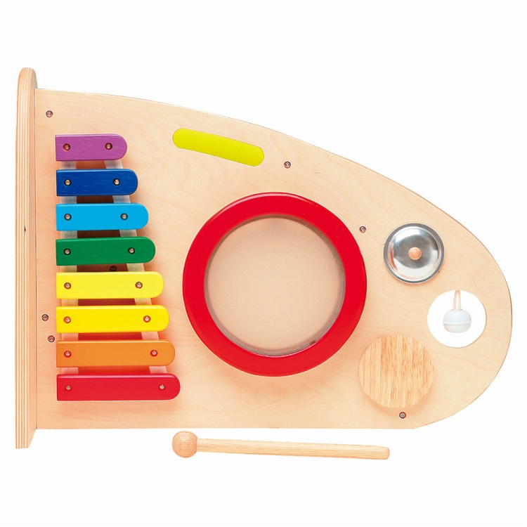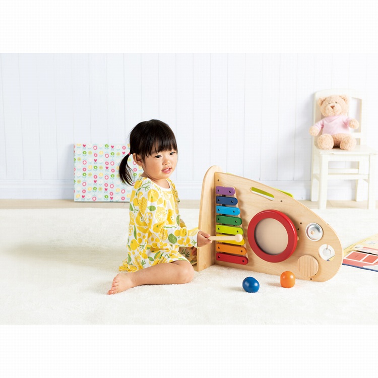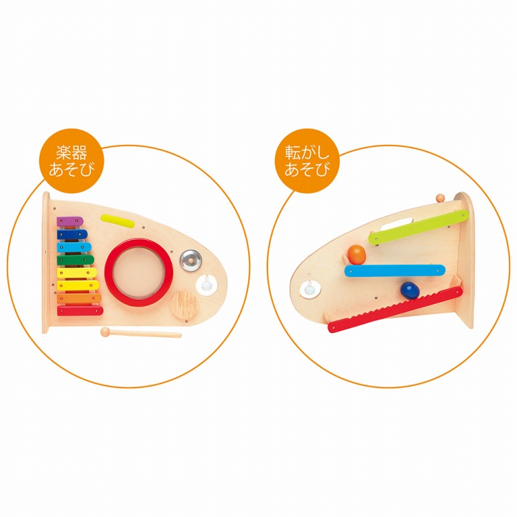 木琴・太鼓・シンバル・鈴・ギロの5種類の音あそびと、転がしあそびが楽しめます。