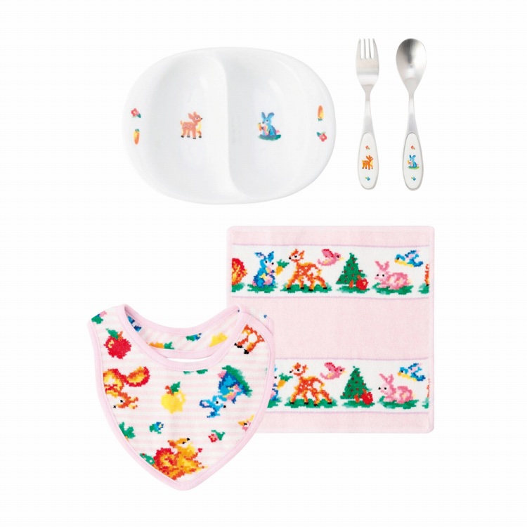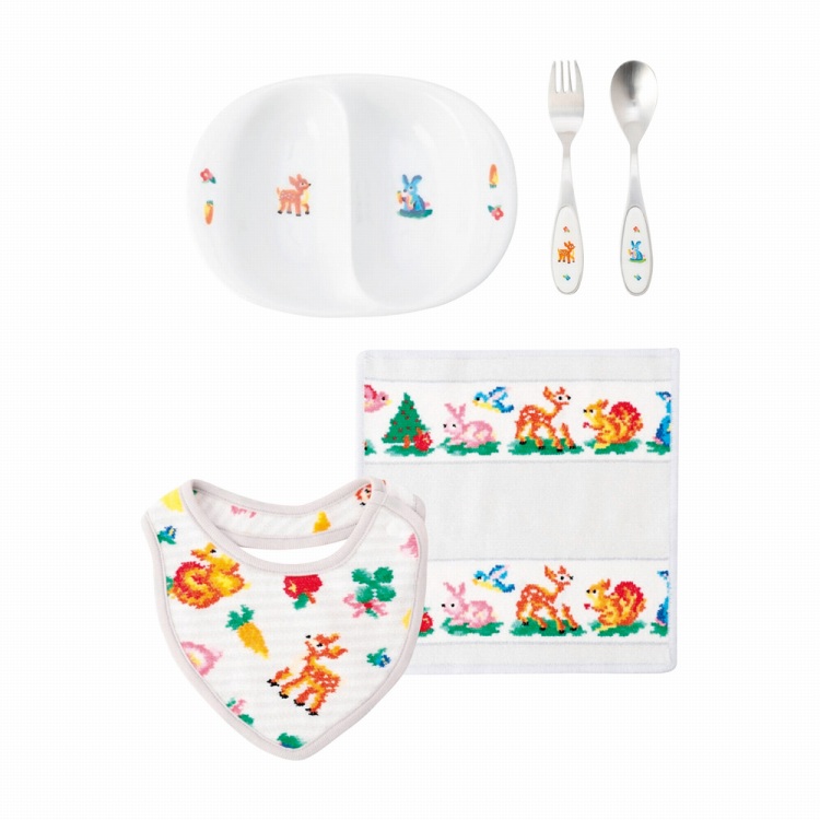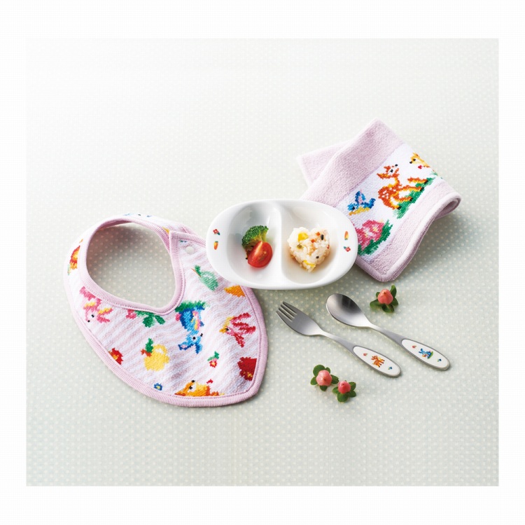 ●材質:スタイ/(本体)綿100%(シュニール織)・(フチ部分)綿100%、ハンカチ/綿100%(シュニール織)、ミニプレート/強化耐熱磁器、フォーク・スプーン/ステンレス・エポキシ樹脂