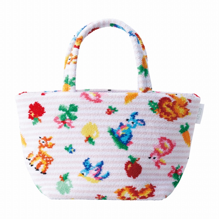 かわいい動物や四葉のクローバーがちりばめられた楽しい柄のバッグ。