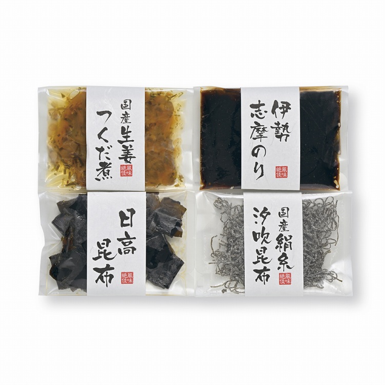 商品内容●セット内容:伊勢志摩のり100g・生姜つくだ煮50g・日高昆布50g・絹糸汐吹昆布20g各1