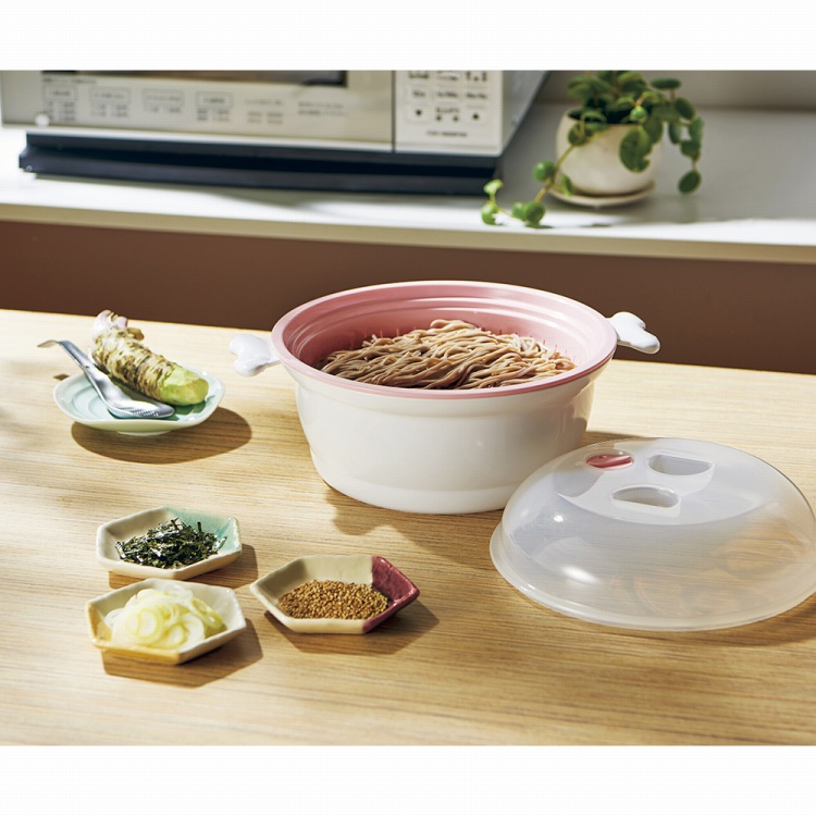 水切りや蒸し調理、温野菜、茹でもできる電子レンジ用蒸し鍋です。