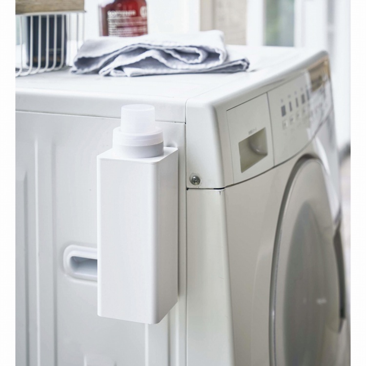マグネットで洗濯機に取り付けられる詰め替え用ランドリーボトル。