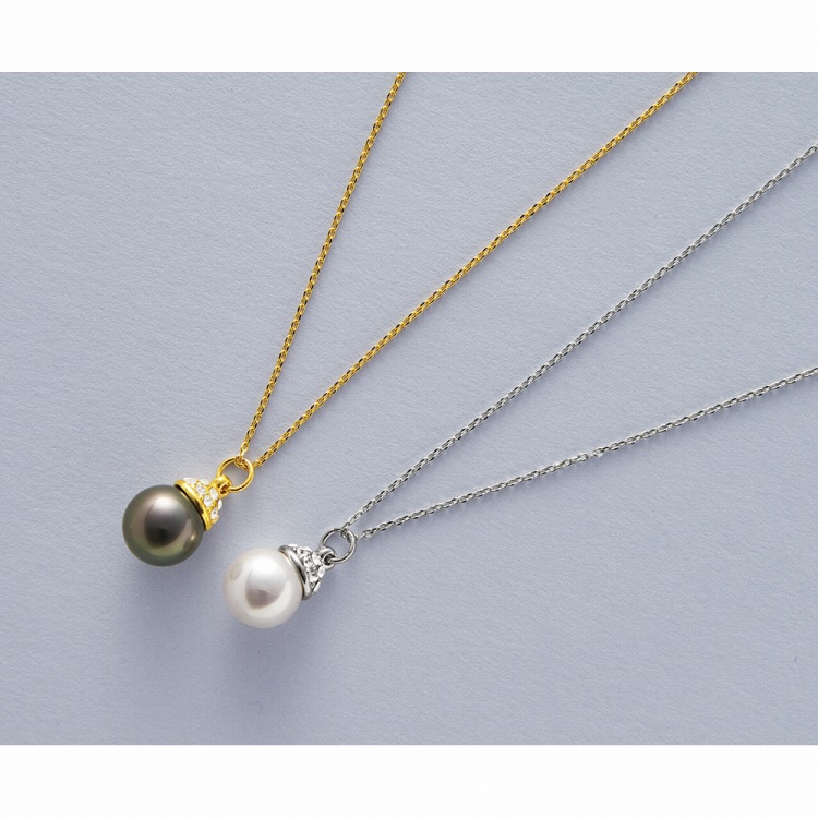 ●材質:ヘッド/人工貝パール(約径10mm)・ガラス、鎖/真鍮(グレー/ゴールドメッキ、ホワイト/ロジウムメッキ)