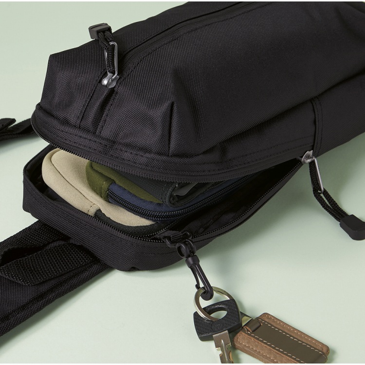 ●内容:内部/オープンポケット×1、前面/ファスナーポケット×1、開閉部ファスナー式、ショルダーベルト(着脱不可・左右取付可)、キーフック付