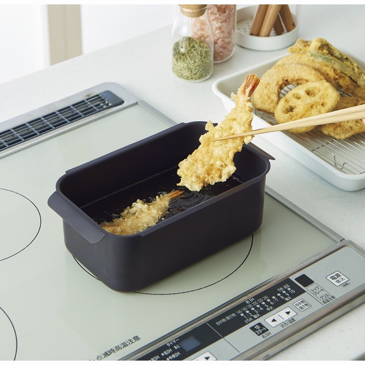 エビやアスパラ等の長い食材も揚げやすい角型の天ぷら鍋。